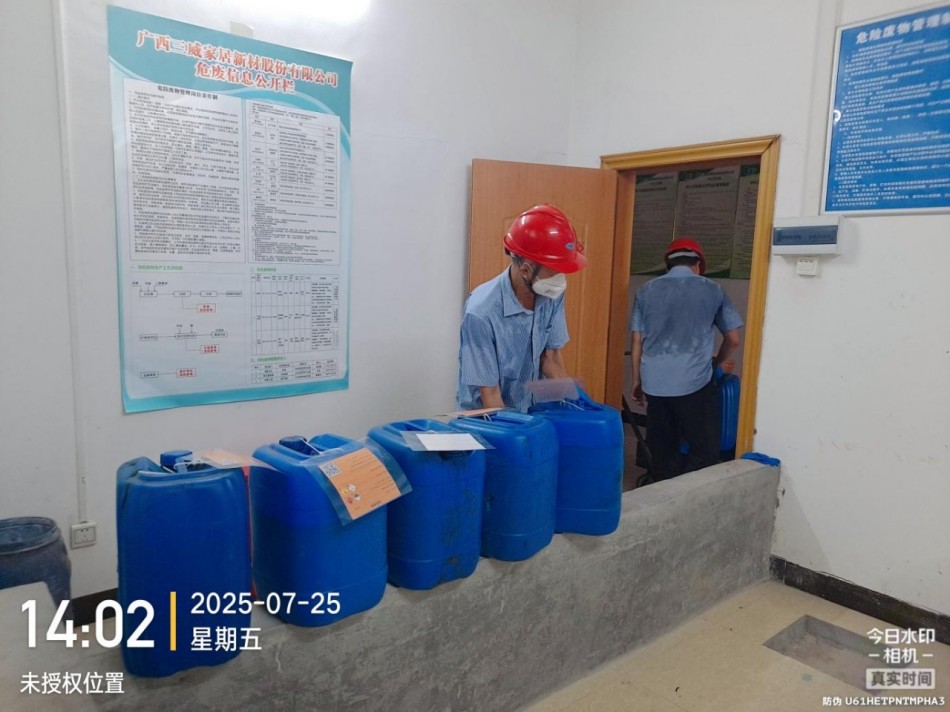 為加強危險廢物管理工作,切實規(guī)范化危險廢物產(chǎn)生、暫存、轉(zhuǎn)移、處置全流程管理。三威公司對危險廢物進行委托轉(zhuǎn)移處置。2025年7月4日進行廢礦物油轉(zhuǎn)移,化驗廢液及脲醛樹脂膠渣于2025年7月25日進行轉(zhuǎn)移。