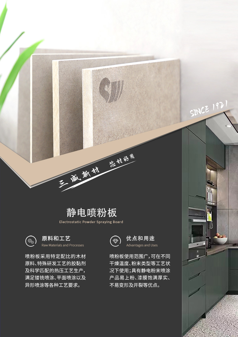 靜電噴粉板基材在靜電粉末噴涂加工中質(zhì)量穩(wěn)定,不開裂,漆膜飽滿密實(shí),物理加工性能優(yōu)良,支持異形設(shè)計(jì)(如免拉手)。加工而成的噴粉板具有零甲醛、無污染?、無VOCs等有害物質(zhì)釋放,耐磨且抗敲擊,無需封邊設(shè)計(jì)?,六面無縫噴涂工藝,成品整體性強(qiáng),而且兼具防水防潮功能。